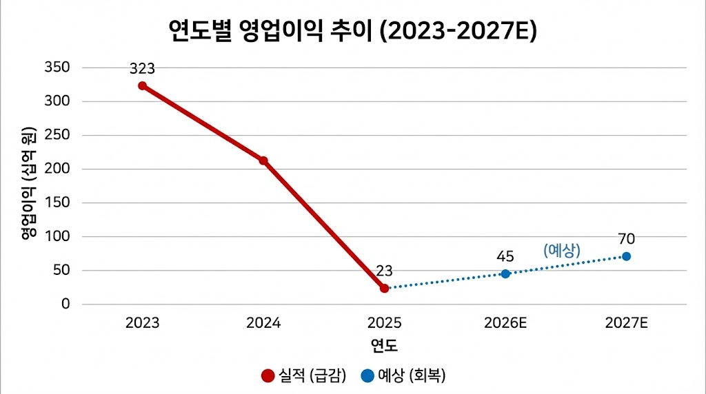 - 2년 연속 실적 급락: 영업이익이 323억원에서 23억원으로 급감하며, 수익성이 바닥을 쳤습니다.