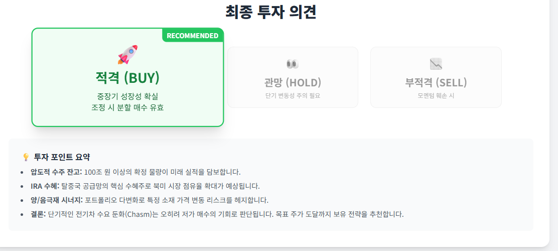 따라서 지금 무리하게 추격 매수하기보다는, 전기차 업황의 근본적인 회복 신호가 나타나거나 주가가 합리적인 수준으로 조정되었을 때 진입하는 전략이 유효해 보입니다.