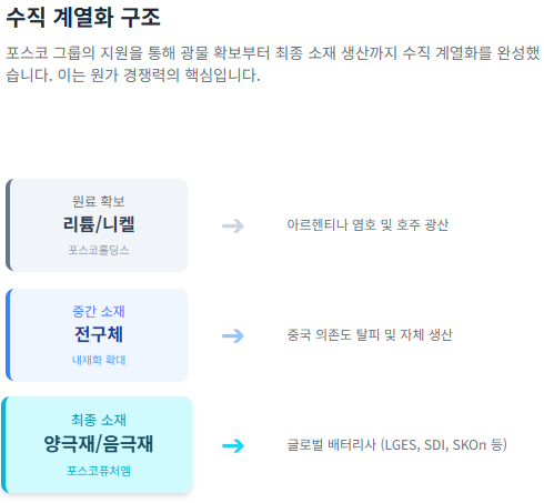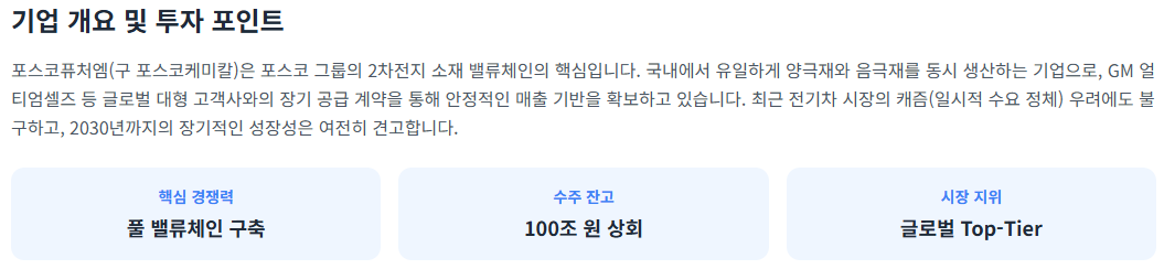 - 독보적인 음극재 경쟁력: 최근 글로벌 완성차 업체와 6,700억 원 규모의 대규모 음극재 공급 계약을 체결했습니다. 탈중국 공급망을 구축하려는 서구권 업체들에게 포스코퓨처엠은 가장 매력적인 파트너입니다.